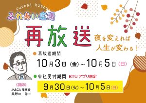 2025年10月5日 / 最終更新日時 : 2025年10月5日 jasca-btu お知らせ 📱再放送は本日まで! 9月30日のふれあい広場『夜を変えれば、人生が変わる!疲れた心に効く!上質な睡眠の秘訣とは?』の再放送は本日まで! ↓ショート動画はこちら↓ 再放送のフル動画も無料でどなたでも見ることができます! 申込受付も閲覧もBTUアプリからのみで10月5日本日迄です!(BTUアプリ登録も無料) BTUアプリご登録後、『研修のお申し込み』からお申し込みください。ご登録のメールアドレスに動画のURLが届きます。 詳しくはこちらから 〈ふれあい広場再放送〉『夜を変えれば人生が変わる!』 関連