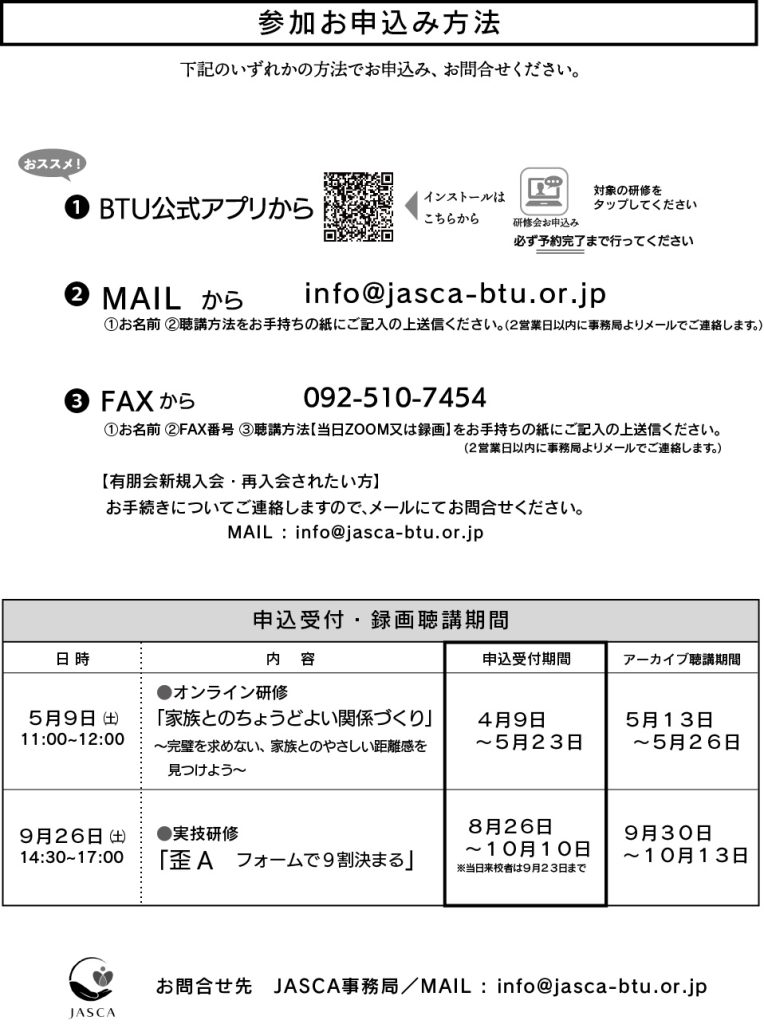 申込受付方法2024年12月中旬頃にお届けの会報誌同封の案内をご参照の上、BTUアプリまたはお問い合わせフォームまでお申込みください。1回の研修ごとに受付期間を設けます。