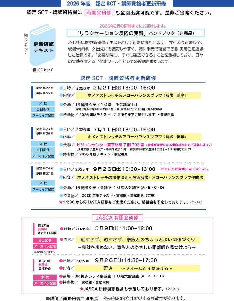 2026年研修日程(2025年12月25日更新) ↓PDFデータはこちら 2026年度認定SCT・講師資格者更新研修(最終)ダウンロード 〈重要〉2026年研修日程変更(2025年11月22日更新) 実技研修の日程が変更になりました。 (変更前)2026年9月12日 → (変更後)2026年9月26日